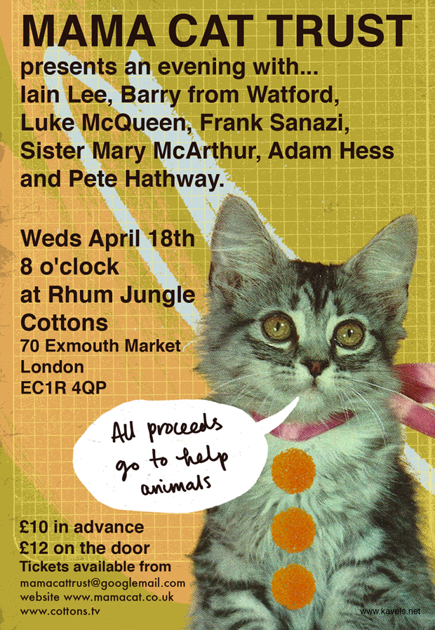 For the first time ever, I have organised an event to raise much needed funds for Mama Cat Trust and here it is……an evening of comedy with Iain Lee, Barry from Watford, Luke McQueen, Frank Sanazi, Sister Mary McArthur, Pete Hathway and Adam Hess. They have all been kind enough to say yes! It should be FUN!