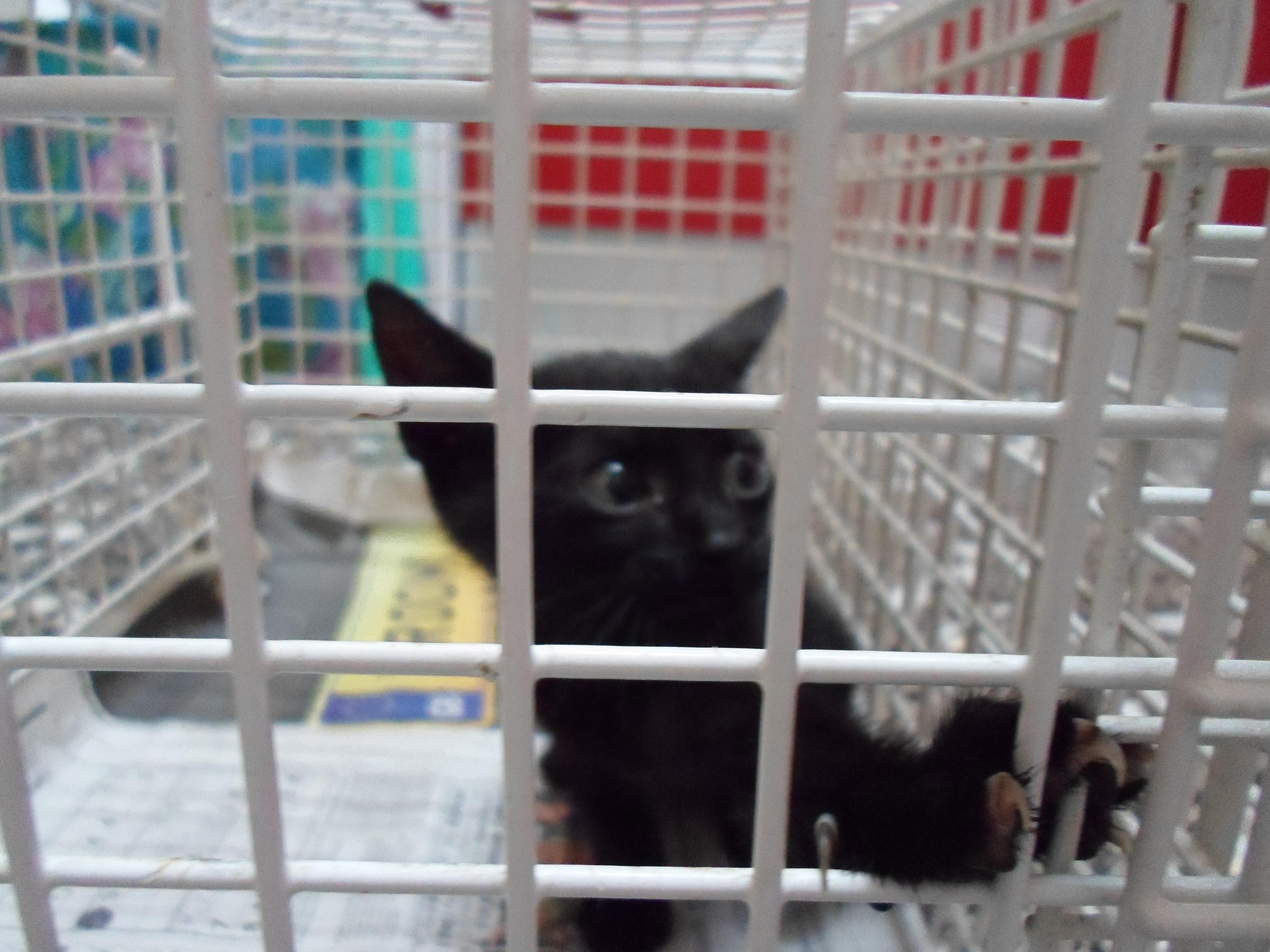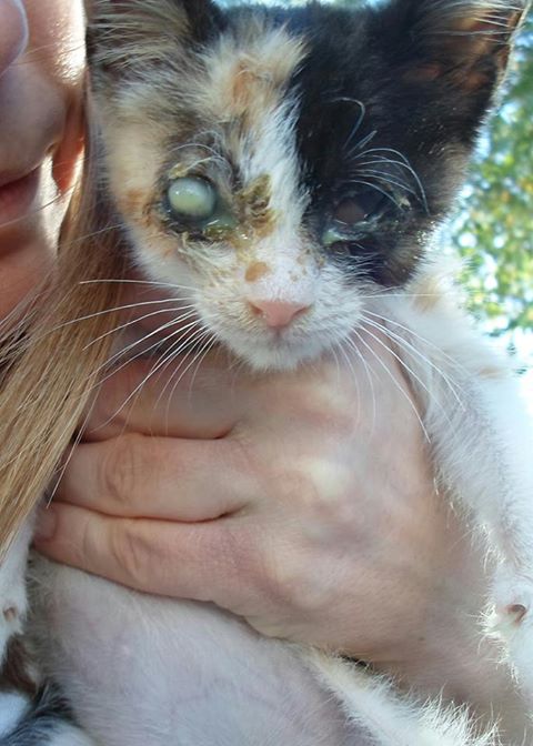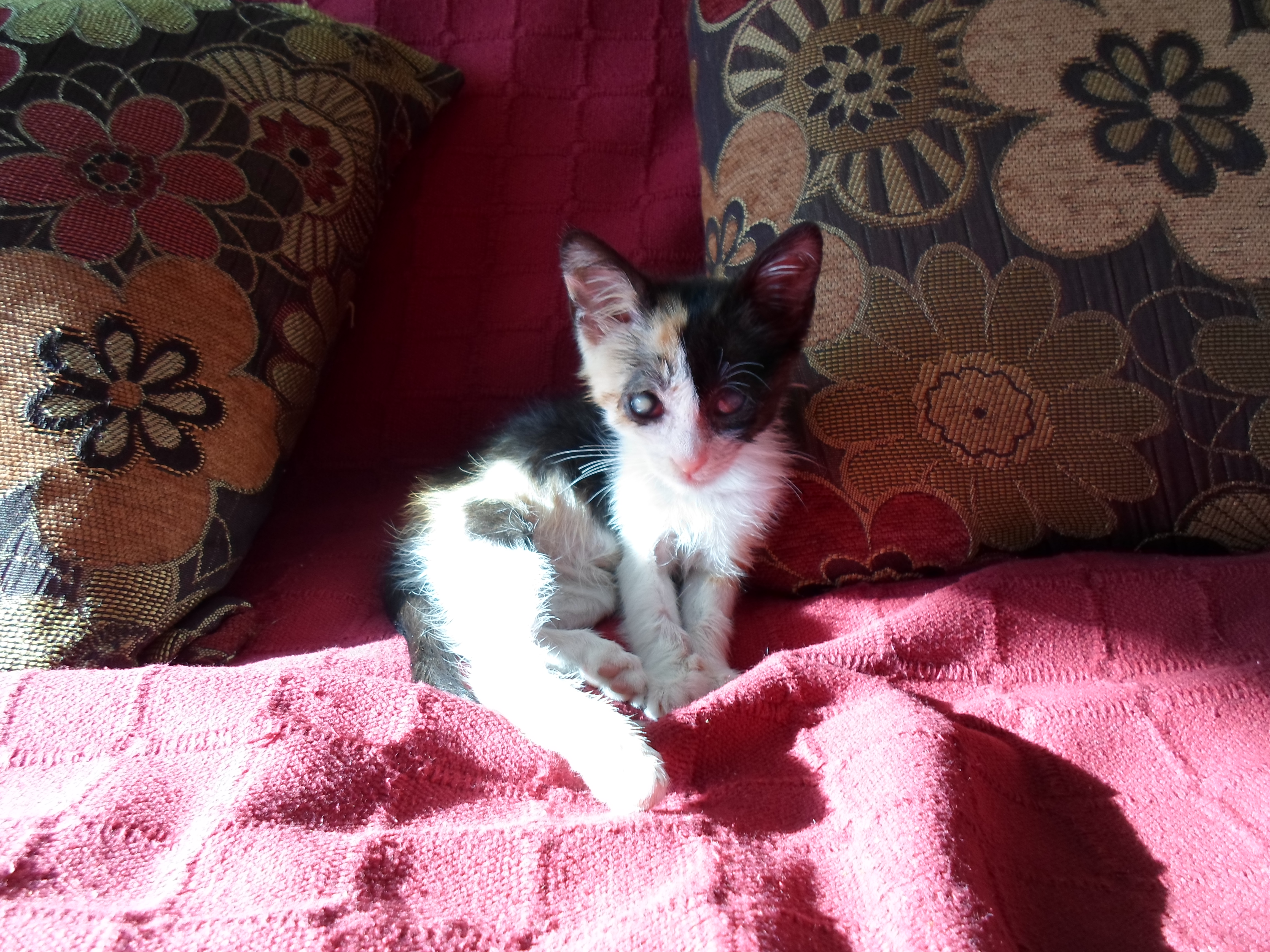On my very first day, when checking an area where I have sterilised many cats, I looked over a wall and saw a tiny calico kitten curled up on a slab. I thought she was dead but when I reached through the wire and touched her, she jumped up and was thrilled and purring so loudly but I immediately saw that her eyes were badly ulcerated and she could hardly see. It is a place where the cats are fed and someone had just left her there to take her chances. She was about 6 weeks old. I scooped her up immediately and she was delighted!