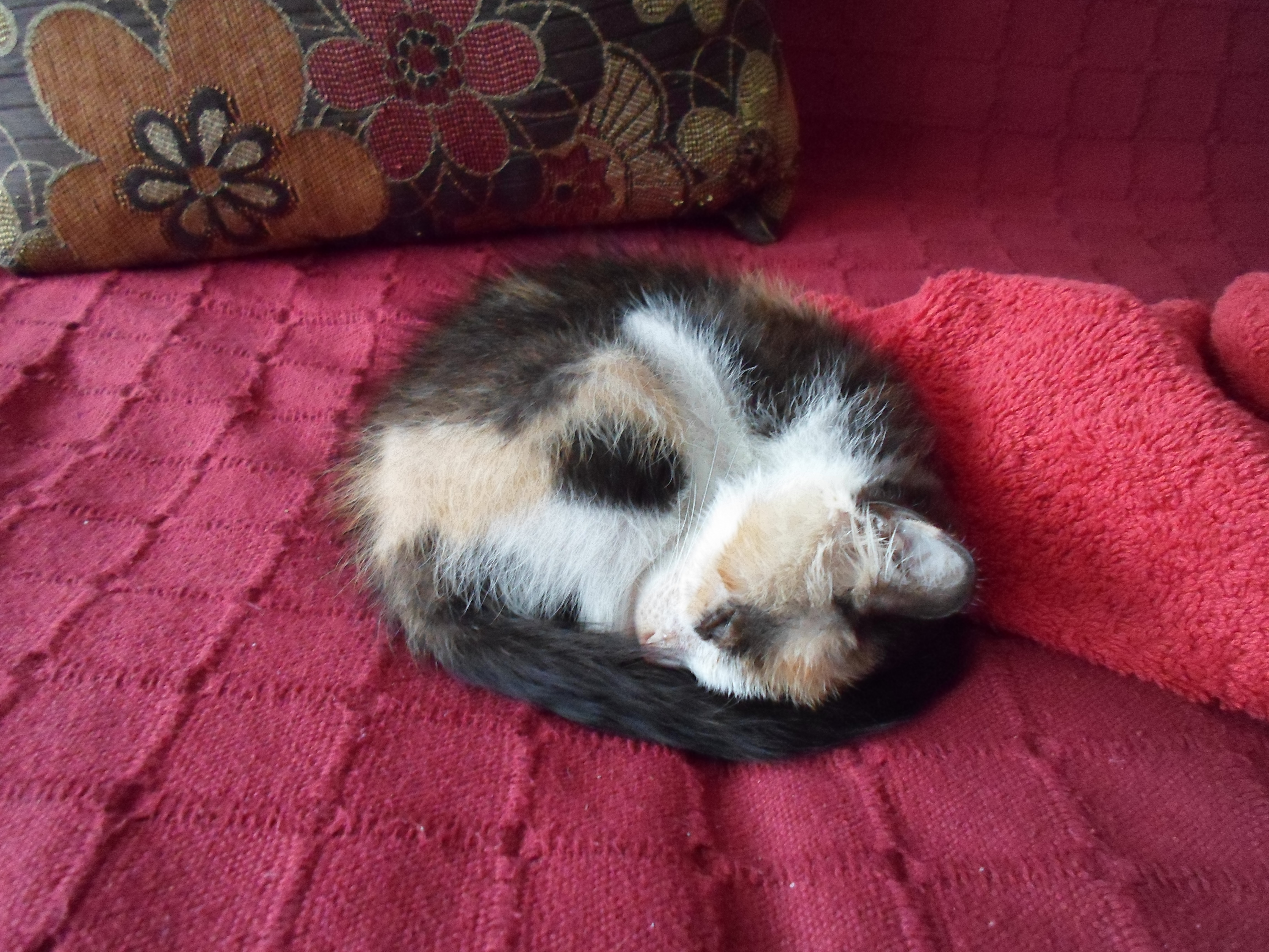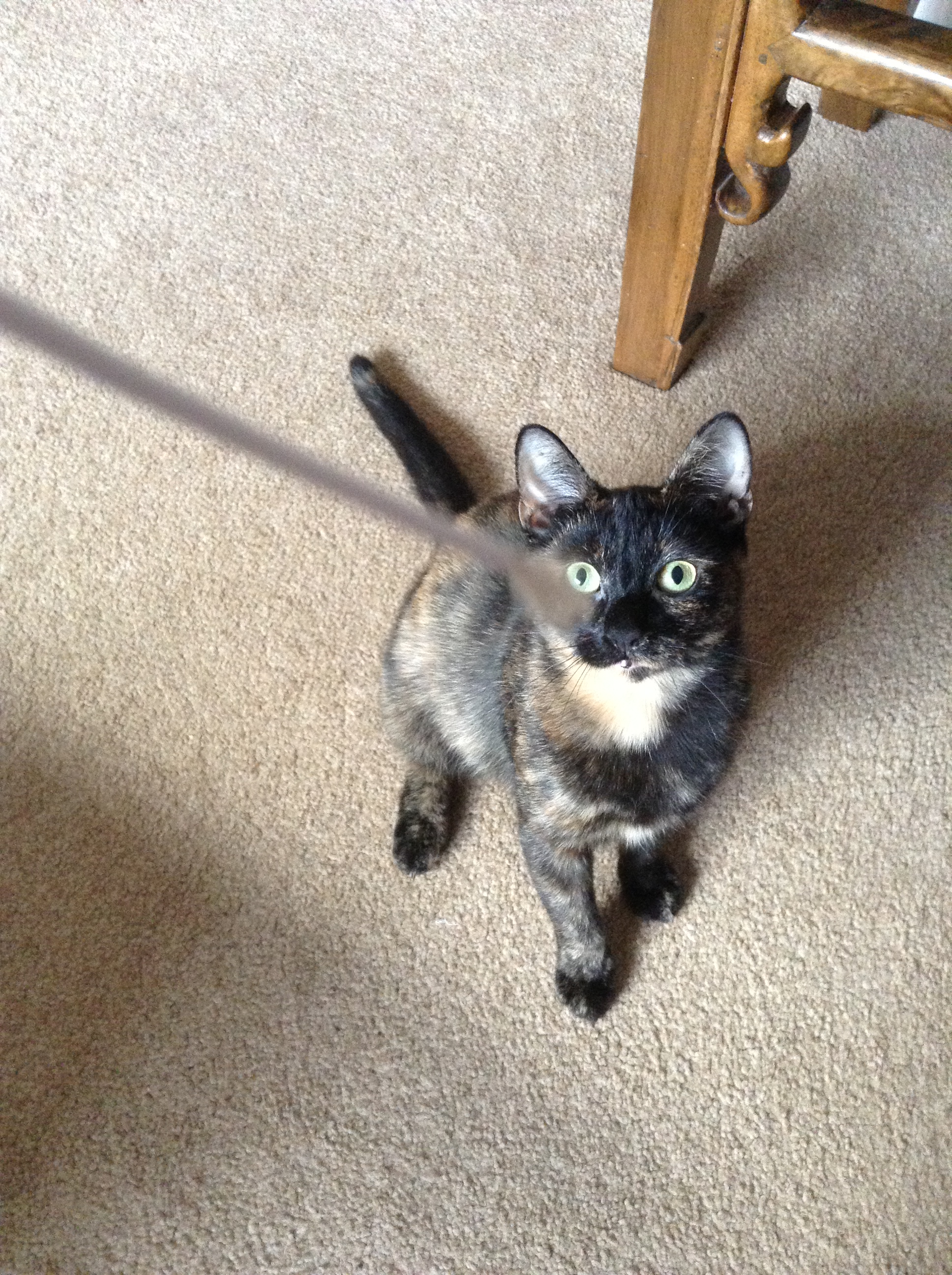 I took the baby to the vets and had to give her a lot of different medications several times a day. She insisted on coming to bed and sleeping on or next to my head and although she couldn’t see, she worked out where everything was-she is the jolliest little kitten you could ever meet-she is amazing! She doesn’t let her lack of sight stop her-she plays like crazy-she didn’t at first but I got her chasing crinkly, noisy things and she soon got the hang of it and was belting around!